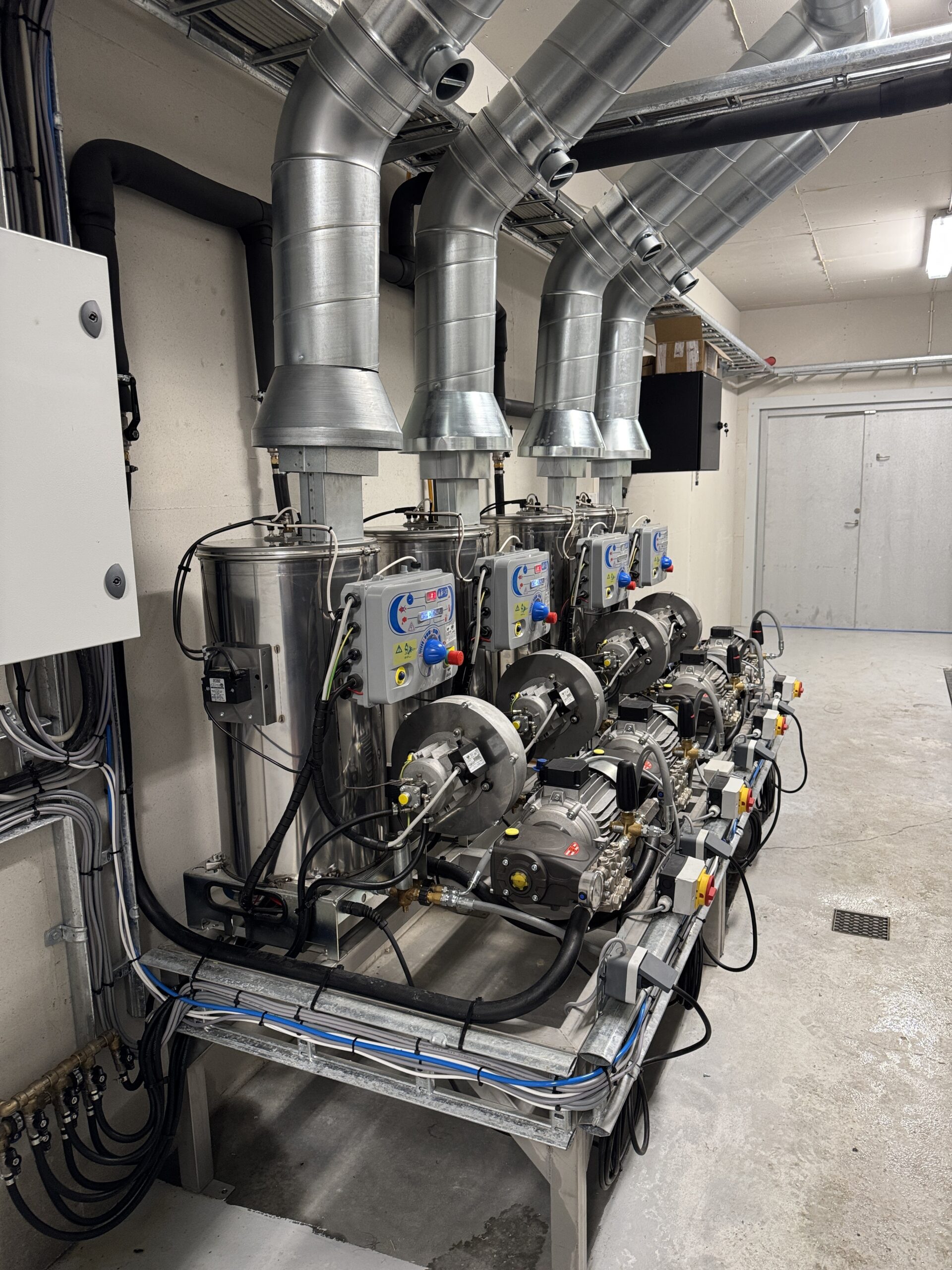 Vi leverer lavtryksanlæg som forsyner fra 1 bruger med op til 25 bar og en vandmængde fra. ca. 30 L/min. Dette system kan benyttes uden at man anvender maske, derved navnet lavtryk.